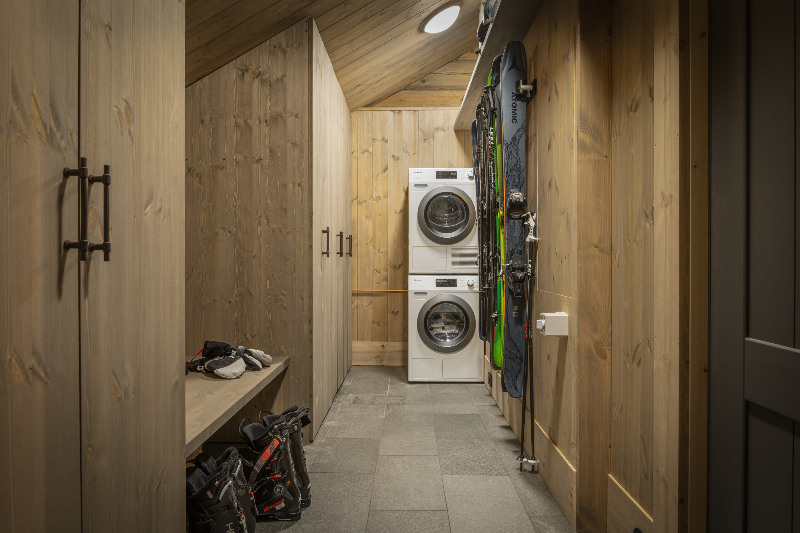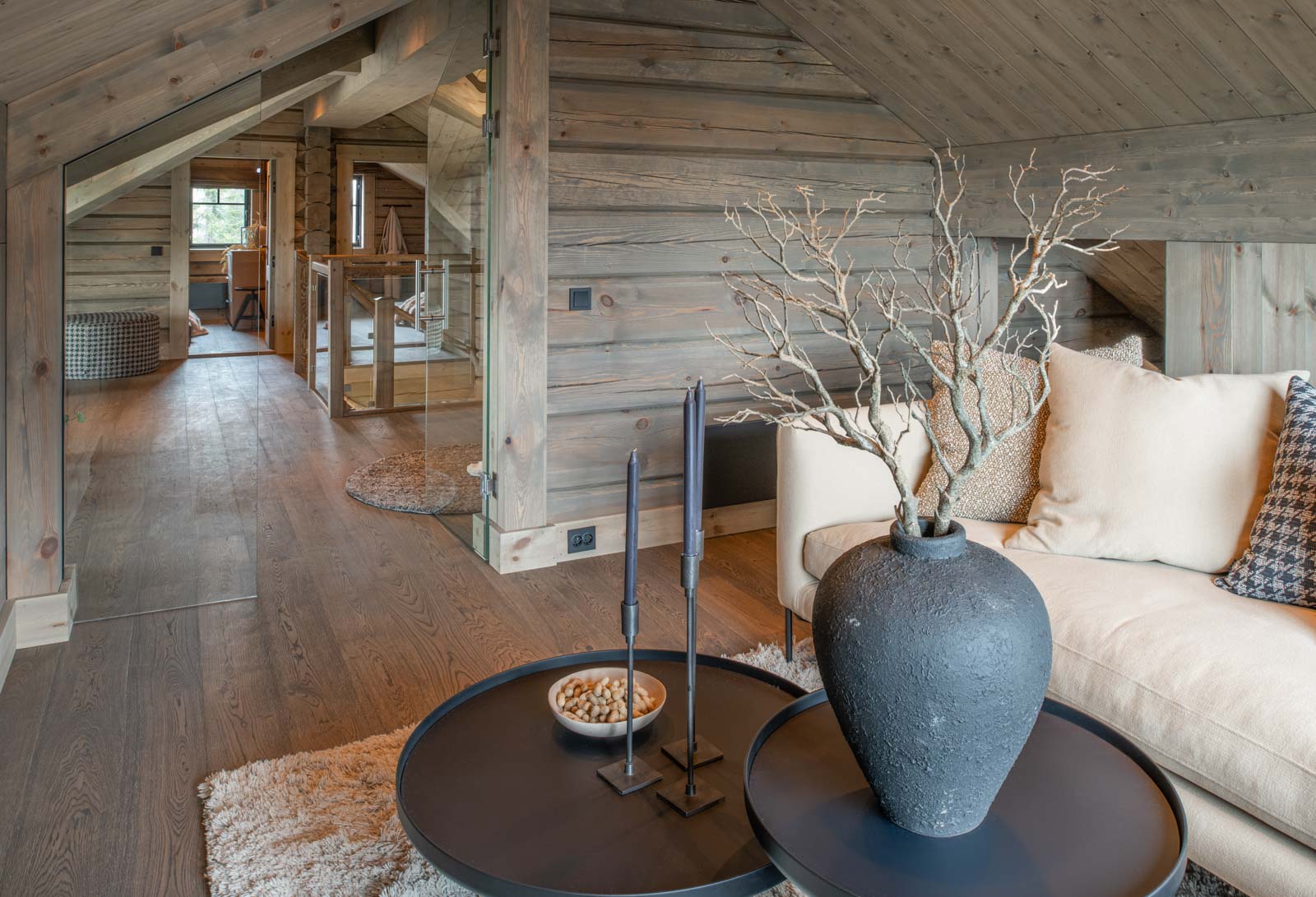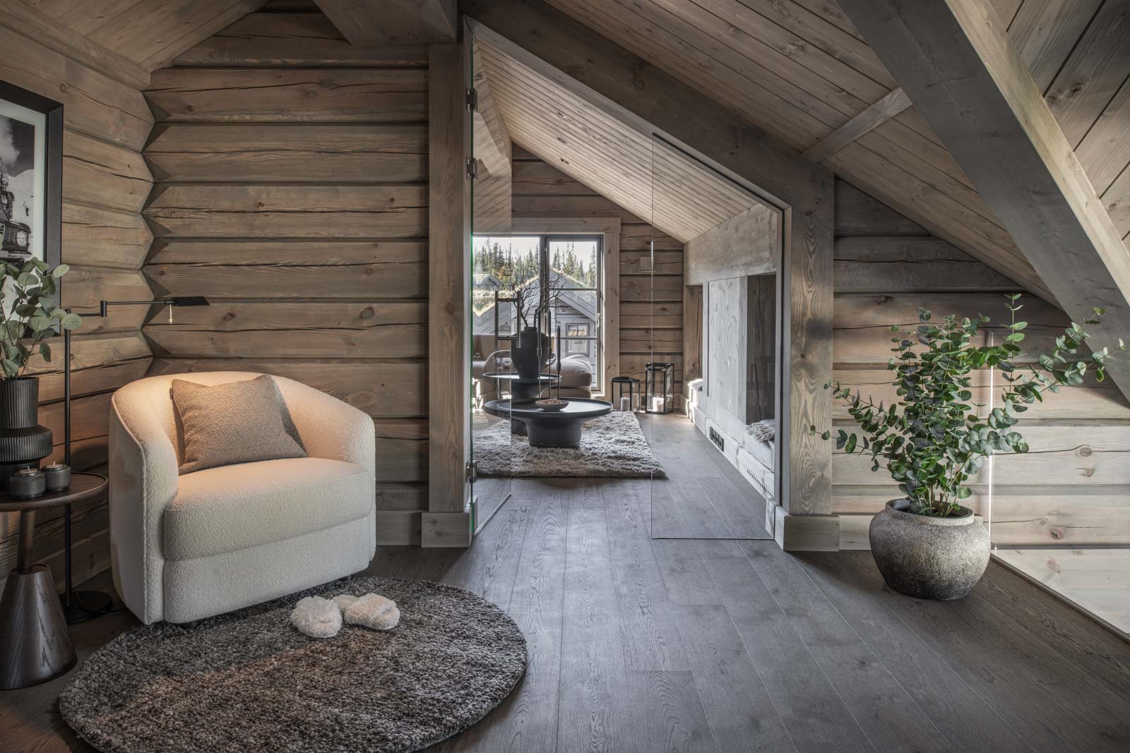 Interiøret i alle Laftestølen-hyttene gjenspeiler nordisk autentisitet med naturlige eike- og furuoverflater og presise detaljer. Vegger og tak er dekket med malte furupaneler, komplementert av synlige bjelker, gulv i naturlig eikeparkett. Skreddersydde furudører og -lister sikrer et helhetlig design.
