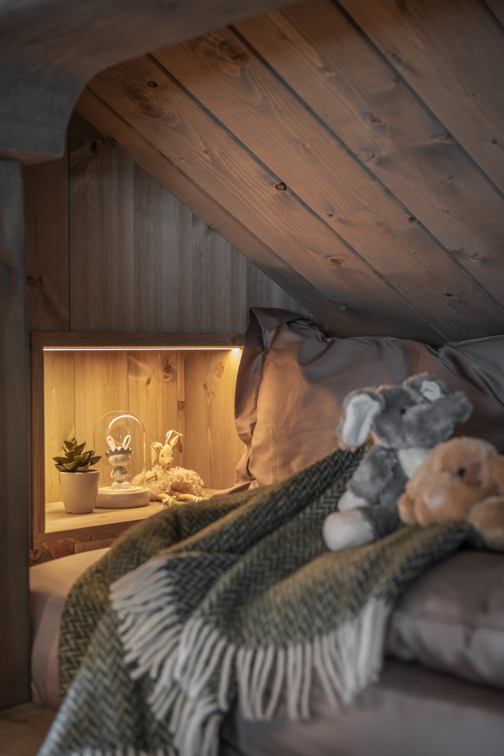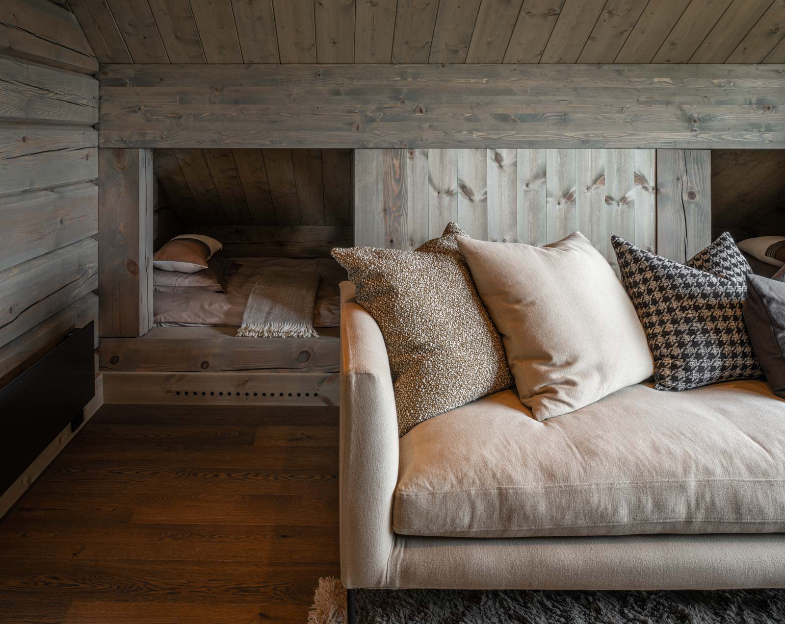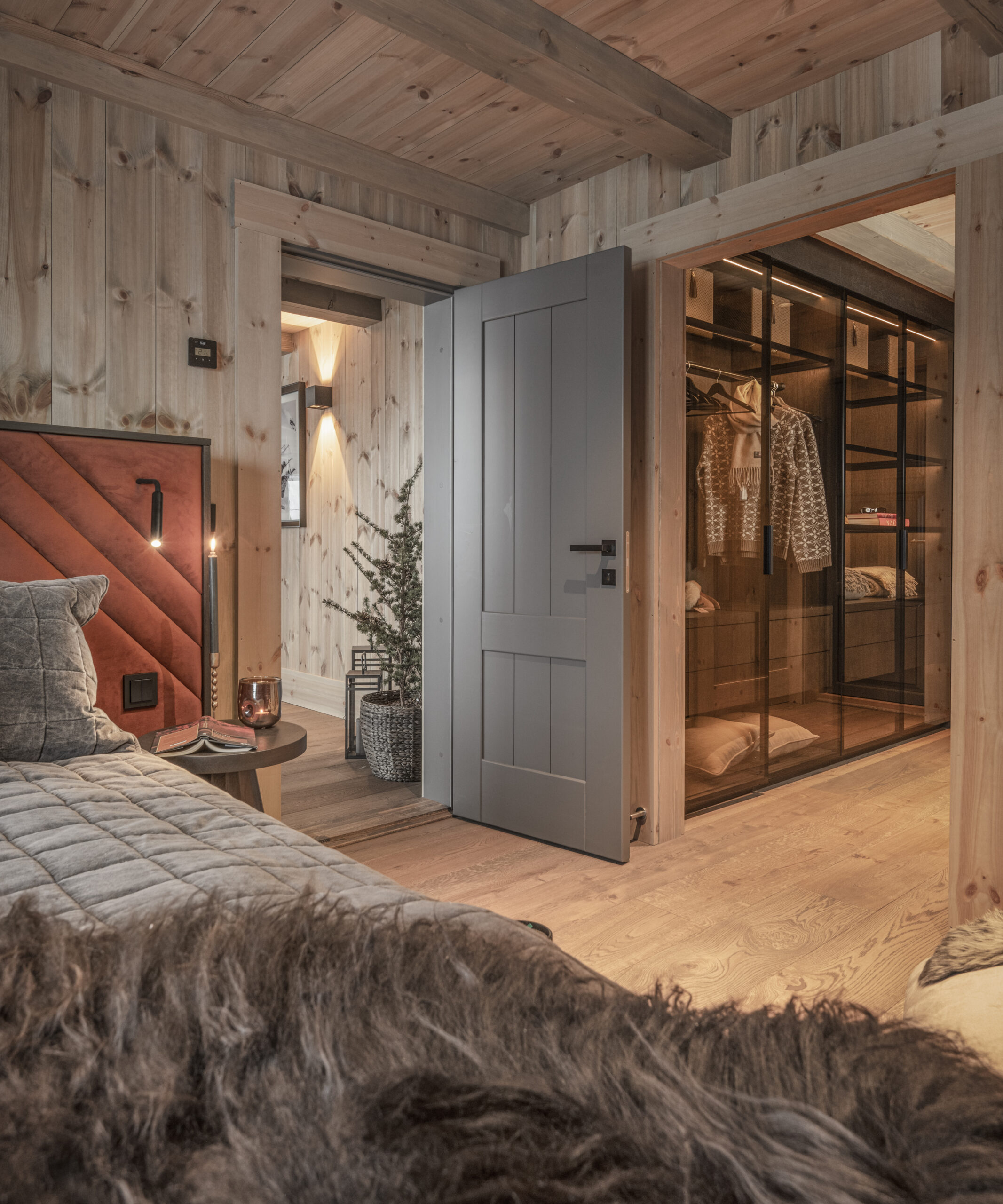 Interiøret i alle Laftestølen-hyttene gjenspeiler nordisk autentisitet med naturlige eike- og furuoverflater og presise detaljer. Vegger og tak er dekket med malte furupaneler, komplementert av synlige bjelker, gulv i naturlig eikeparkett. Skreddersydde furudører og -lister sikrer et helhetlig design.